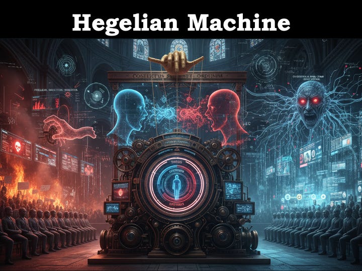 The Hegelian Machine is a self-perpetuating system of governance. It sustains power through crises, engineered opposition, and media manipulation,