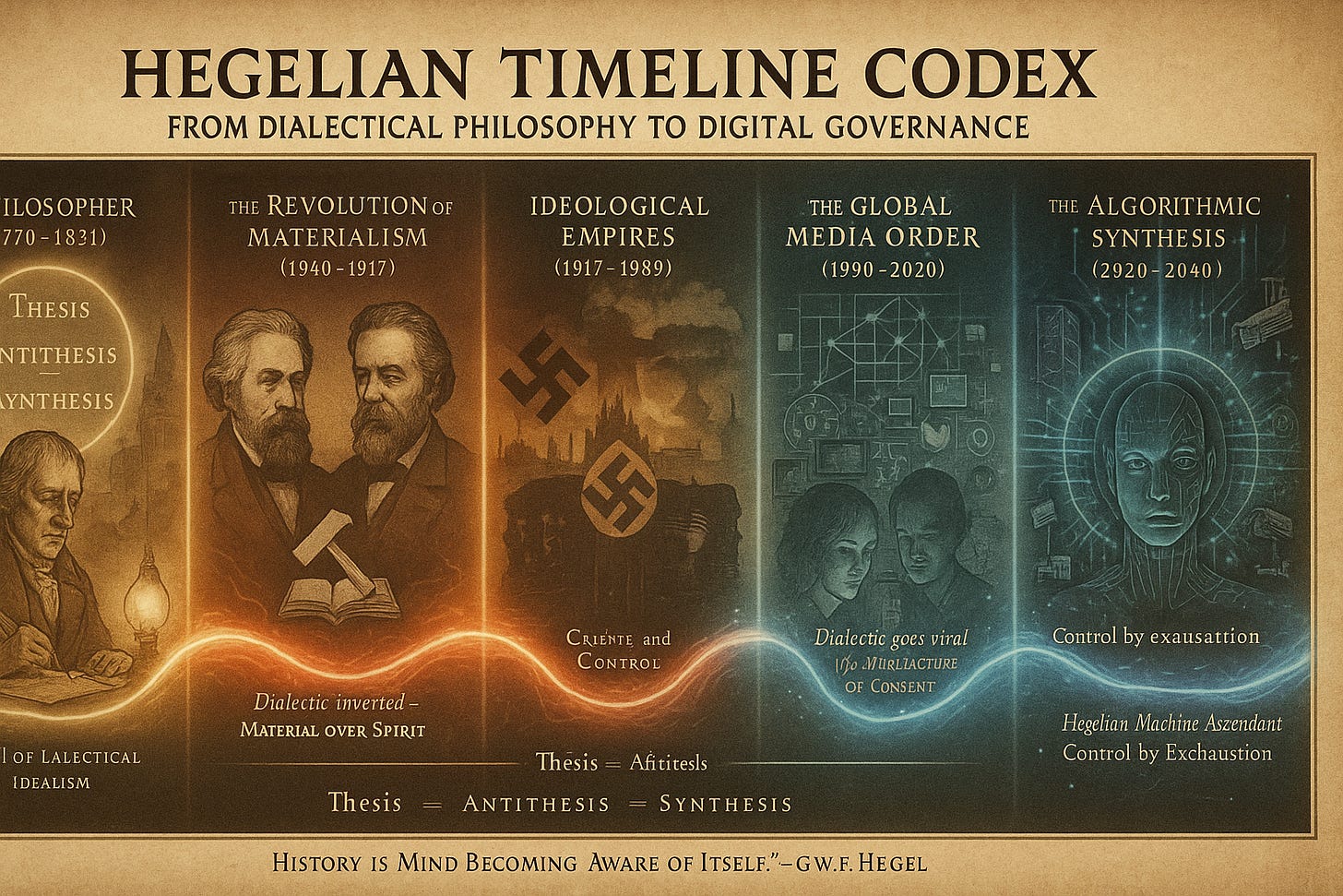 If the architecture of incremental control is the structure, and the inversion of freedom its ideological disguise, then the Hegelian Machine is its engine—the method by which social direction is manufactured through the orchestration of conflict. The dialectical process, as described by Hegel and later weaponized by political engineers, operates through three stages: thesis, antithesis, and synthesis. It is the formula of managed opposition—the art of creating both problem and solution.
